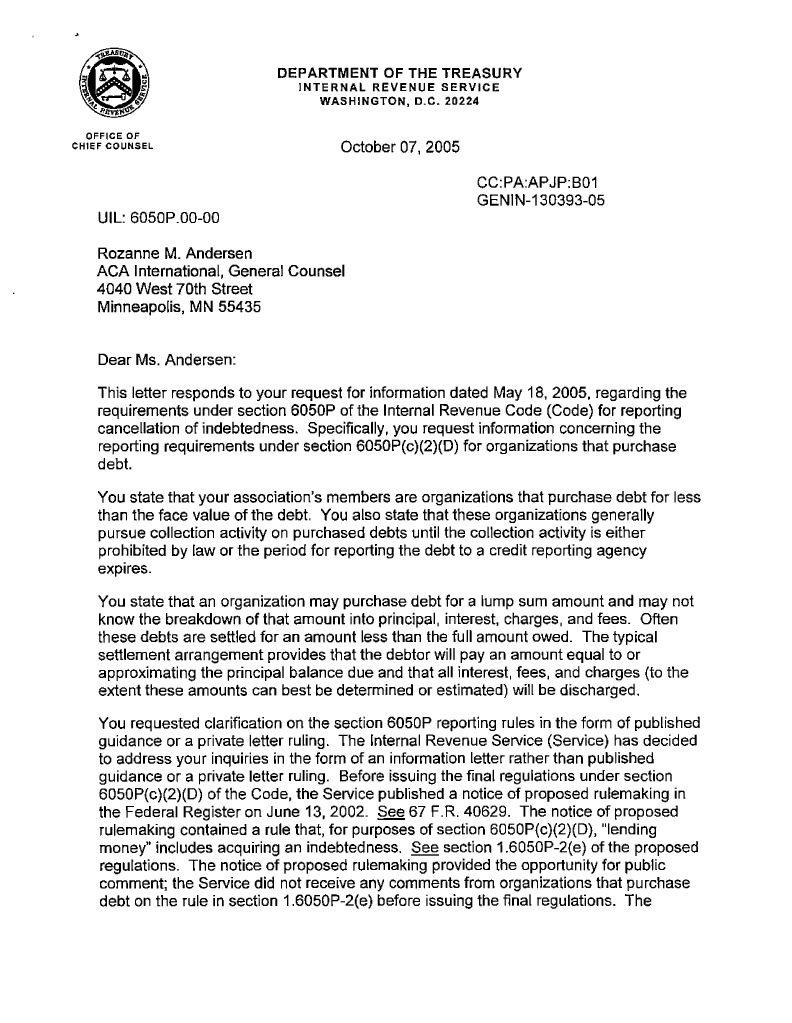 Irs Letter To Aca Request For Guidance On Issuing 1099 C To Consumers Pdf